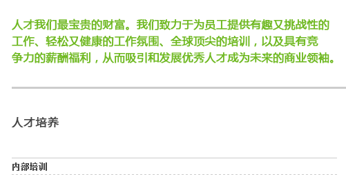 富惟公司是當今為數(shù)不多的采用內(nèi)部提升制的企業(yè)之一。內(nèi)部提升制已經(jīng)成為富惟企業(yè)文化的顯著表現(xiàn)形式之一,是富惟用人制度的核心,也是富惟取得競爭優(yōu)勢的一個重要源泉。隨著富惟公司的成長而一道成長的員工的自豪感和主人翁意識保持了公司的凝聚力。